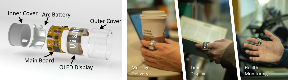 Abstract. We introduce VisRing, the first smartring incorporating a bendable 160 x 32 4-bit grayscale organic light-emitting diode display. VisRing stands out by displaying nano visualizations while maintaining a compact design and minimal weight of 6.6 g, with an overall cost of around $35. We exploit opportunities for a system-on-a-chip architecture to tightly integrate an inertial measurement unit, a photoplethysmograph sensor, a temperature sensor, Bluetooth, a microcontroller, and a display unit that spans 270° to 360° , depending on finger size. Our contributions include the hardware design and implementation of VisRing, along with a software library that supports visualizing various data types. A qualitative study with 12 participants demonstrated the comfort, likability, and social acceptance of VisRing's hardware and software. The participants liked the visualizations and found the ring lightweight, but also pointed out possible improvements. All materials are shared under an open-source license to enable the community to extend and improve VisRing.