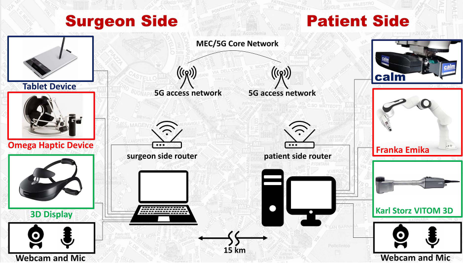 Abstract. Robotic telesurgery is a new concept in surgical care that has gained relevance over the past two decades. Now, with the introduction of 5G mobile networks, this concept is becoming practical. Here, we report that surgeons successfully performed complex transoral laser microsurgeries on the vocal cords of an adult human cadaver located 15 km away from them. This was possible thanks to a high bandwidth and ultra-low latency 5G telecommunication system, which allowed for precise remote control of robotic instruments and full HD ( 1920x1280 pixels) 3D visualization of the surgical site. During the operation, the mean video transmission latency was 102±9 ms with the maximum latency being 140 ms, but this was observed during less than 1% of the operation time. This latency did not cause any deterioration in surgeons’ performance. Our results demonstrate that surgical expertise can be exploited and shared efficiently using the new 5G telecommunication standard. This is critical for highly specialized operations such as the microsurgeries demonstrated here, which require surgical expertise that are not widely available. Therefore, the possibility to operate from a distance can bring significant benefits to healthcare systems, reducing costs and enhancing treatment quality for patients. In addition, it makes telementoring a reality, allowing expert surgeons to be present virtually in multiple operating rooms to guide and train less experienced colleagues.