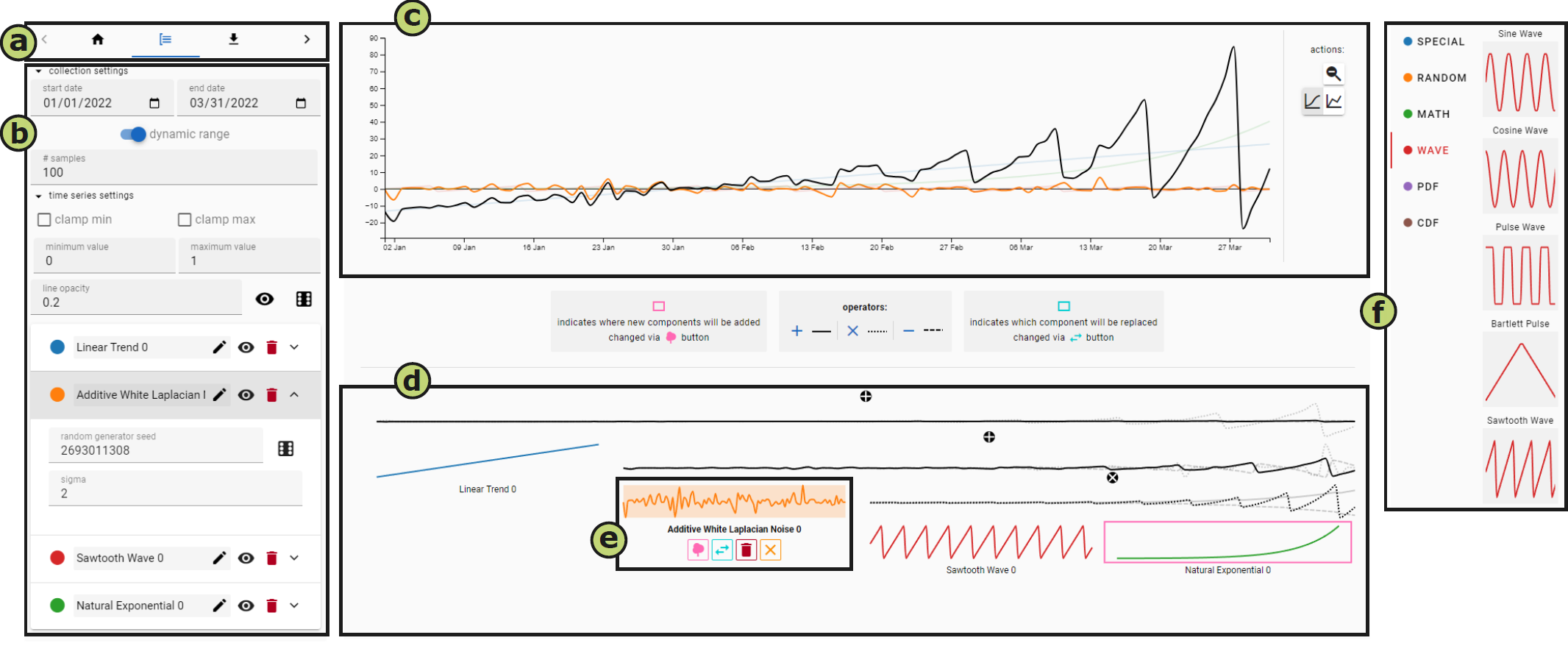Abstract. TimeSeriesMaker is an open-source application to visually compose time series data in an intuitive and shareable manner. Visualization researchers often use time series data in studies about perceptual or cognitive phenomena and many other contexts. However, finding or generating time series data that fits a given scenario is not always easy. Using a component-based architecture, TimeSeriesMaker allows analysts to compose time series data with complex patterns by combining different components, such as noise, a linear trend or a seasonal pattern. An interactive compositor tree of these components lets analysts explore their combinations using different operators. We support reproducibility and transparency by including functionalities that allow analysts to export and share their configuration, which others can use to reload and modify the same time series. In a qualitative online study with visualization researchers, we found that our approach enables them to create a time series based on an example image or their own requirements. However, system usability could be further improved when interacting with the compositor tree. TimeSeriesMaker can be found here: https://unistuttgart-visus.github.io/time-series-maker/.