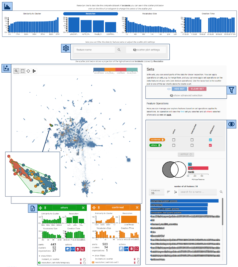 Abstract. Security providers typically deal with large numbers of alerts based on heterogeneous data from many endpoint sensors. While the number of alerts is generally much smaller than the volume of raw data, most alerts are false positives that do not reflect genuinely malicious activity. All types of experts work on such alerts, be it to determine whether they are indeed false positives, to build machine learning models to support their analysis or to keep an eye on the current threat landscape. We conducted a design study to support a diverse group of experts whose working environments are connected to the same alert data. Based on an ongoing industry project that clusters alerts, we designed and evaluated a visual analytics system which enables exploration via powerful, easy-to-understand filtering mechanisms framed through set operations. In this article, we describe our system, give a detailed breakdown of the design process and the lessons we learned. We discuss the results from expert interviews, which showed the set-based framing to align with experts’ intuitive approach to data analysis and helped users uncover improvement opportunities for the clustering and detection pipelines.