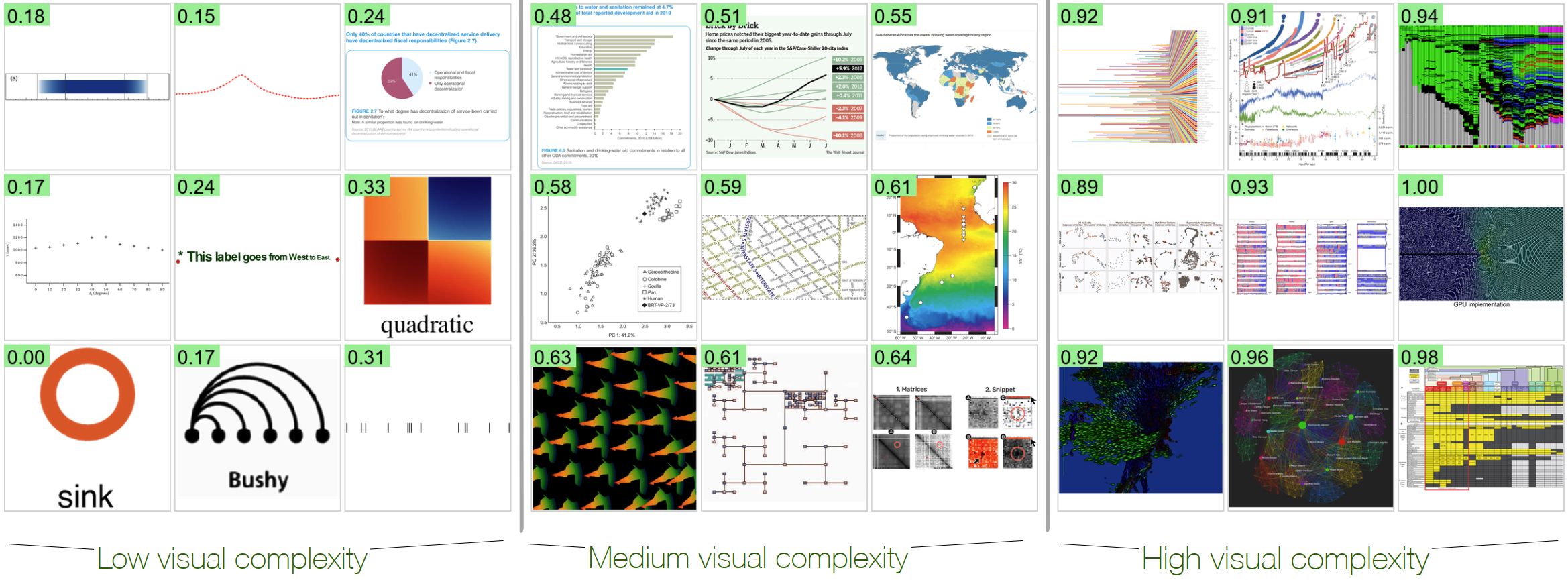 Abstract. We investigate the perceived visual complexity (VC) in data visualizations using objective image-based metrics. We collected VC scores through a large-scale crowdsourcing experiment involving 349 participants and 1,800 visualization images. We then examined how these scores align with 12 image-based metrics spanning pixel-based and statistic-information-theoretic (clutter), color, shape, and our two new object-based metrics (meaningful-color-count (MeC) and text-to-ink ratio (TiR)). Our results show that both low-level edges and high-level elements affect perceived VC in visualization images; the number of corners and distinct colors are robust metrics across visualizations. Second, feature congestion, a statistical information-theoretic metric capturing color and texture patterns, is the strongest predictor of perceived complexity in visualizations rich in the same continuous color/texture stimuli; edge density effectively explains VC in node-link diagrams. Additionally, we observe a bell-curve effect for texts: increasing TiR initially reduces complexity, reaching an optimal point, beyond which further text increases VC. Our quantification model is also interpretable—enabling metric-based explanations—grounded in the VisComplexity2K dataset, bridging computational metrics with human perceptual responses. The preregistration is available at osf.io/5xe8a. osf.io/bdet6 has the dataset and analysis code.