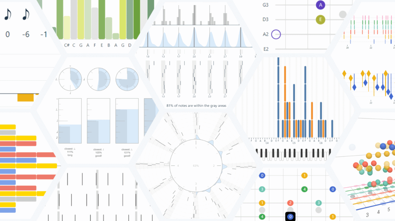 Abstract. We explore the potential of visualization to support musicians in instrument practice through real-time feedback and reflection on their playing. Musicians often struggle to observe the patterns in their playing and interpret them with respect to their goals. Our premise is that these patterns can be made visible with interactive visualization: we can make the unhearable visible. However, understanding the design of such visualizations is challenging: the diversity of needs, including different instruments, skills, musical attributes, and genres, means that any single use case is unlikely to illustrate the broad potential and opportunities. To address this challenge, we conducted a design exploration study where we created and iterated on 33 designs, each focusing on a subset of needs, for example, only one musical skill. Our designs are grounded in our own experience as musicians and the ideas and feedback of 18 musicians with various musical backgrounds and we evaluated them with 13 music learners and teachers. This paper presents the results of our exploration, focusing on a few example designs as instances of possible instrument practice visualizations. From our work, we draw design considerations that contribute to future research and products for visual instrument education.