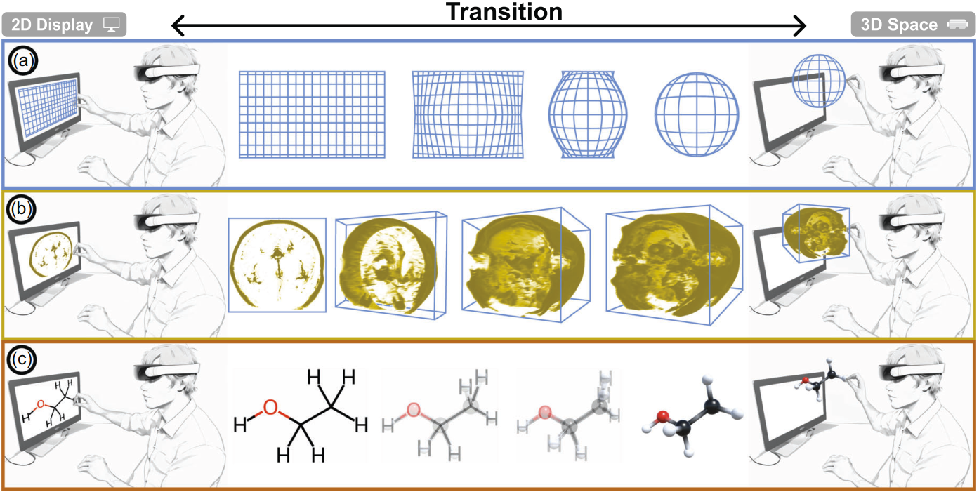 Abstract. Abstract We present design considerations for animated transitions of the appearance of 3D spatial datasets in a hybrid Augmented Reality-desktop context. Such hybrid interfaces combine both traditional and immersive displays to facilitate the exploration of 2D and 3D data representations in the environment in which they are best displayed. One key aspect is to introduce suitable transitional animations that change between the different dimensionalities to illustrate the connection between the different representations and to reduce the potential cognitive load on the user. The specific transitions to be used depend on data type, needs of the application domain, and other factors. We summarize these as design considerations to simplify the decision-making process and provide inspiration for future designs. We apply our concept to three case studies: sparse 3D point data, MRI scan data, and molecular data. Finally, we give some practical guidance for the prescriptive use of our design considerations.
