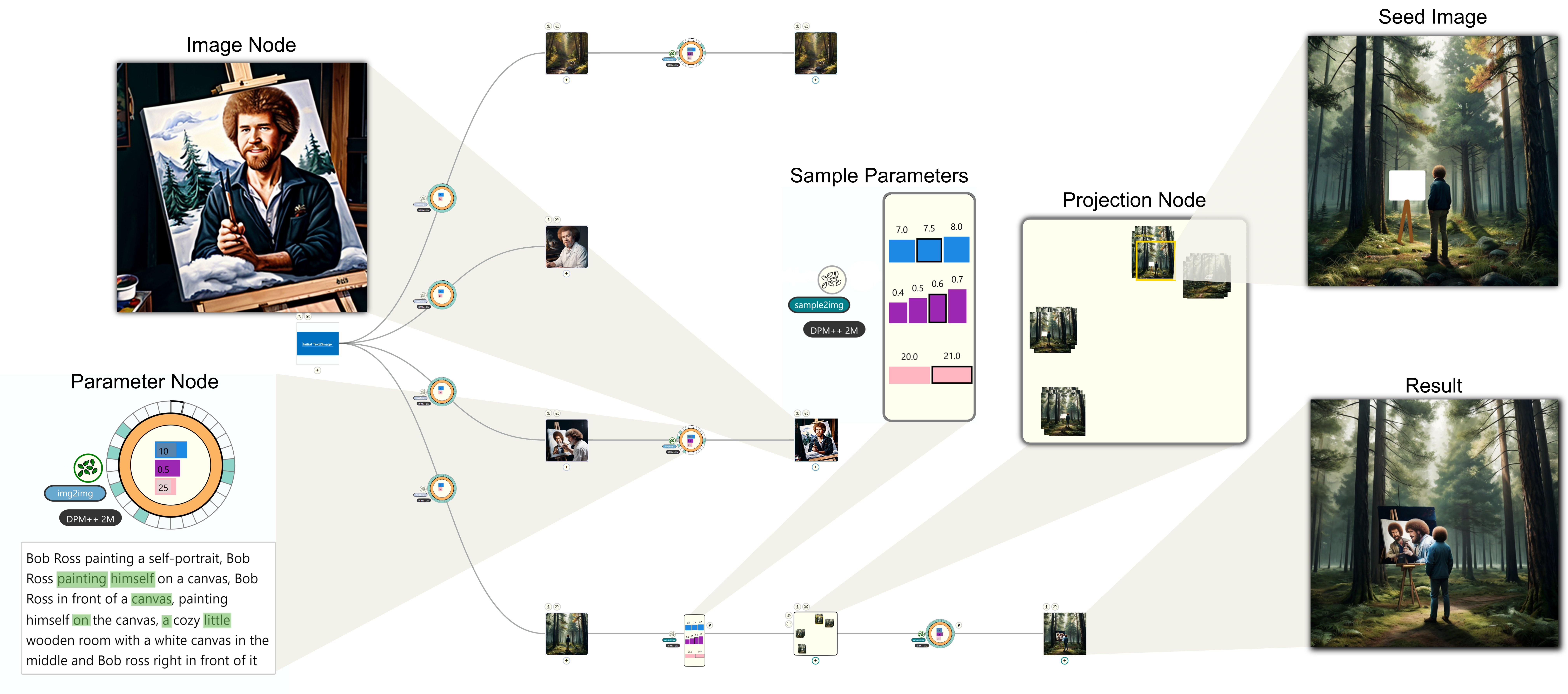 Abstract. Image-generative models have gained popularity over the last years with their ability to create realistic artwork. Realizing complex artworks with specific creative ideas often requires iterative optimization of specialized prompts, but may still result in inadequate images. The inclusion of reference images and adapting modelspecific parameters can help in steering the model and fostering the creative intent of the user. But by providing text prompts, initial images, and adapting model parameters, users face a vast design space for creating images. To navigate through this space, we propose a visualization approach that combines an interactive Provenance Graph, parameter visualizations, and high-dimensional embeddings. Our approach helps pursue multiple parallel creation paths, makes workflows traceable and parameter changes transparent, and facilitates the reporting of image editing steps. In addition to prompt formulation, we focus on targeted generation by probing parameters, image compositions, and editing details. We integrate the generative process into existing image editing software, enabling users to compose artwork in collaboration with the model. The presented approach is evaluated in a user experiment (n=9) for generating artwork. The results show that users with different levels of experience can create targeted artwork but use different strategies when working with the Provenance Graph.