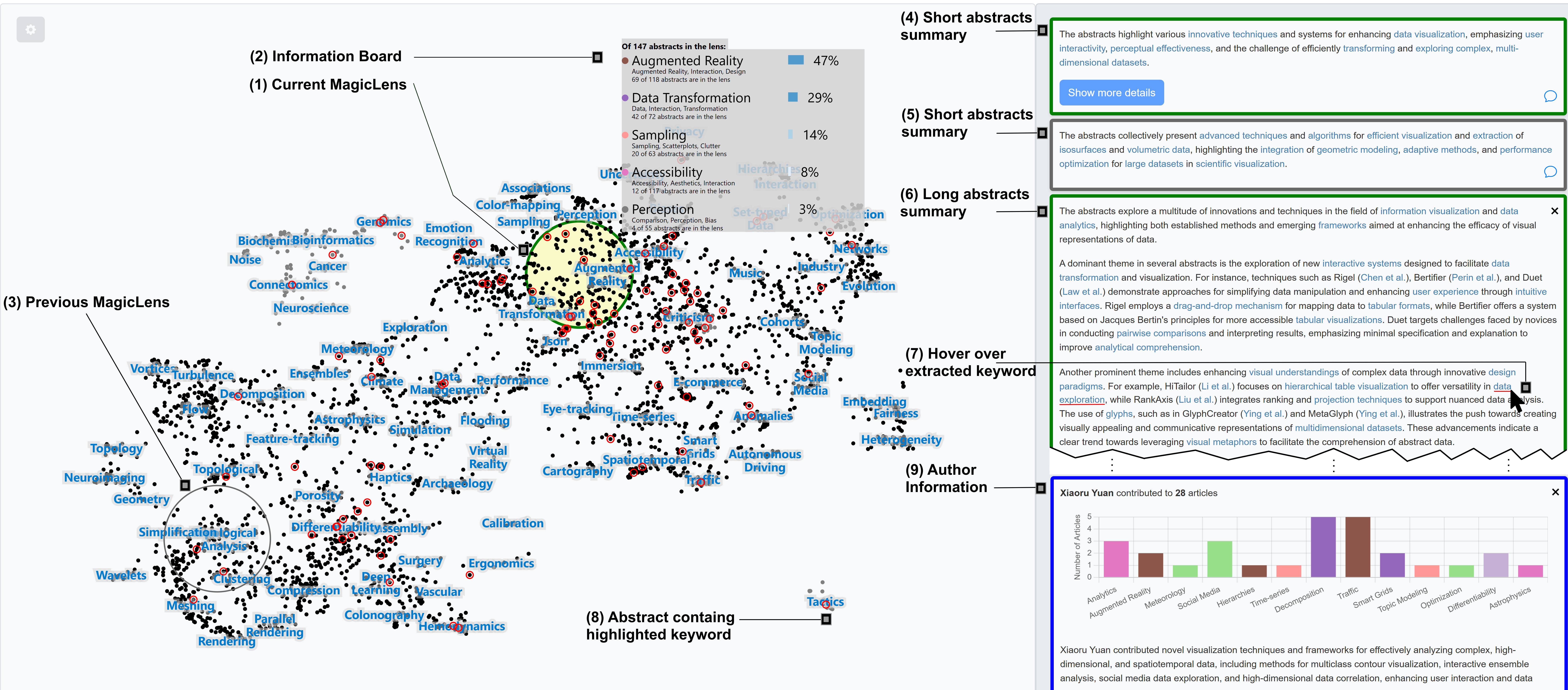 Abstract. Incorporating the analytical power of LLMs with the fast-paced interaction of magic lens-based exploration is an intriguing prospect. Unfortunately, the costs of LLM-generated analyses are high, and applying them continuously seems prohibitive at the moment. Accordingly, we suggest an LLM integration into magic lenses that supports the progressive triggering of costly analyses based on users’ interest in the data hovered with the lens. We exemplify this approach with a lens technique for exploring dimensionality-reduced embeddings of visualization paper abstracts shown in a scatterplot. Our proposed approach links back analysis results to the explored visualization improving the comprehensibility and the assessment of the shown results.